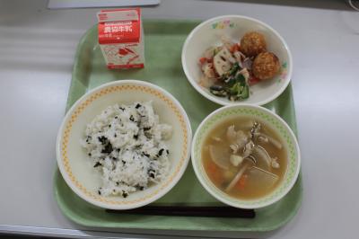 本校の「給食献立コンクール」(給食週間の取組)において、優秀な献立として6年生の2名の児童が考案した献立が選ばれ、そのうちの一つが本日の給食の献立に採用されました。テーマは「地場産物を使った、みんなが喜ぶようなおいしくて色とりどりの献立」です。献立名は「丸いもコロッケ・シャキシャキ!加賀れんこんときゅうりのサラダ・石川県の野菜勢ぞろい!具だくさん味噌汁・わかめ麦ごはん・牛乳」です。「6年生を送る会」の後、美味しくいただきました。