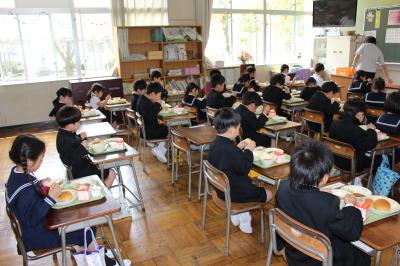 4月13日(水)、いよいよ1年生の給食がスタートしました。安全でおいしく食事ができる時間になるよう、給食指導で学んだことを実践していきましょう。そして、しっかり食べて健康な身体をつくりましょう。1年生は、初日からおかわりをする頼もしい姿が見られました。また、「明日もおいしいごちそう作ってね!」と笑顔のリクエストがあり、嬉しい限りです。初日は、「お祝いいちごゼリー」がメニューにつき、入学をお祝いしました。(初日と2日目の給食の画像です)