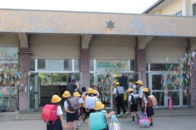 今日7月7日(木)は、七夕祭りです。今年は、CSDの橋本さんが用意してくださった立派な笹に、児童・職員の願い事を書いた短冊と、1・2年生や委員会で作った七夕飾りを飾り付けました。短冊には、みんなの幸せ・平和・健康を願う言葉もたくさん書かれており、胸が熱くなりました。仕上げは、児童会運営委員の6年生が行いました。児童玄関前に色鮮やかに飾られ、サラサラという音もとても涼しげに感じられます。日本の風物詩をCS委員さんや図書ボランティアのみなさんと一緒に作ったことも、大切な思い出になることでしょう。