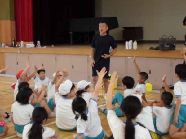 今年度、福岡小学校は県の指定を受けて「投げる力」の向上に取り組んでいます。専門の先生から、遠くにボールを投げるために必要な体の動きをタオルを使って教えていただきました。みんなきれいなフォームで投げられるようになりました。