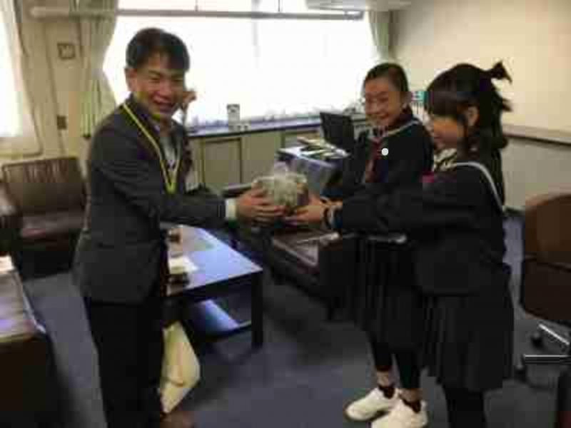 前期児童会役員が、収穫したひまわりの種をひまわり里親プロジェクトの方にお渡ししました。種は福島交通バスのバイオエネルギーとして活用されています。福岡小で育てたひまわりが、東日本大震災の復興へとつながります。