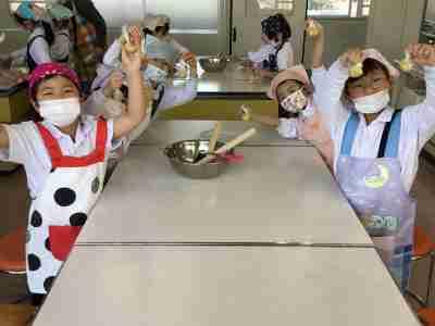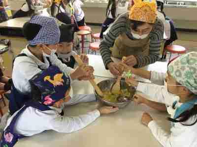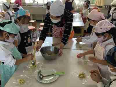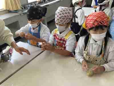 1年生が収穫したさつまいもを使って調理実習をしました。まず、ゆであがったおいもに味をつけてみんなでつぶします。その後、サランラップにのせて、クルクル絞って形を整えると、おいしいスイートポテトが出来上がりました。みんなとっても上手にできましたね。
