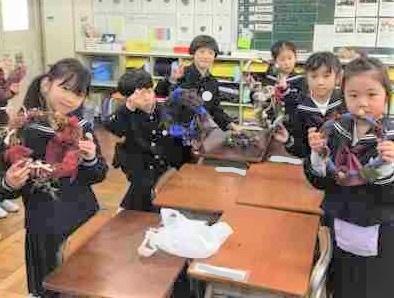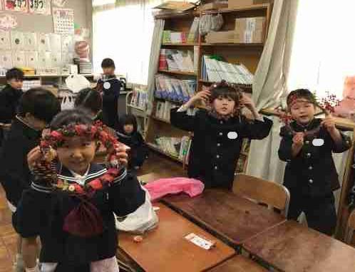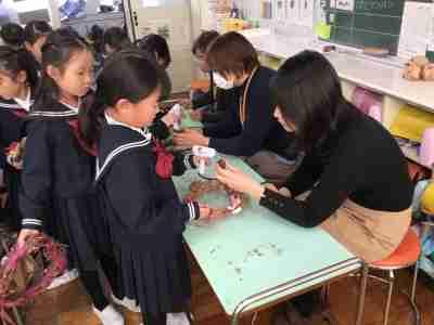 朝顔のつるで作ったリースに飾りをつけて「クリスマスリース」を作りました。自分で準備した材料や運動場で集めたどんぐりなどをバランスよく並べて、学習ボランティアさんと一緒にくっつけました。どの子もとっても素敵に仕上がりました。みんなのリースを飾ったら、学校がぱっと華やかになりました。