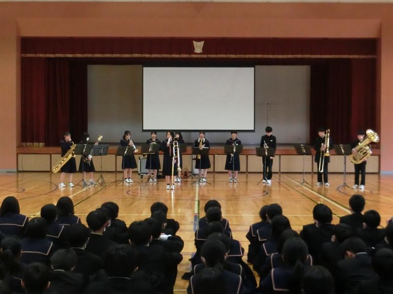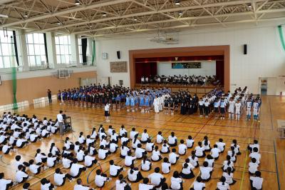 ステージでは吹奏楽部が演奏し選手が体育館に入場して各部のキャプテンが意気込みを発表しました。
