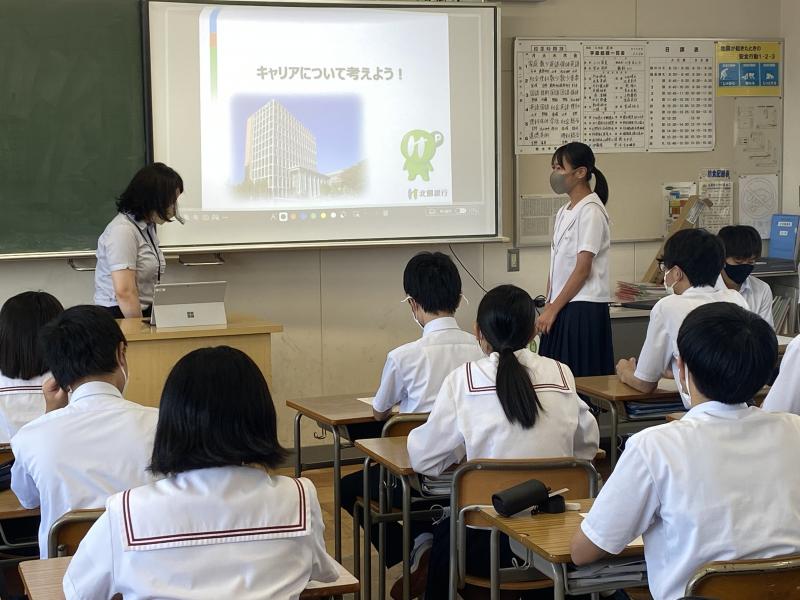 6月30日(木)に1年時にコロナ禍で実施できなかった職業講座を今回、銀行員の方と飲食業経営者の方を実際に講師としてお招きし、お話をしていただきました。