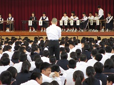 民謡協会ひばり会による民謡鑑賞では、本校生徒2名もお囃子として加わり、素晴らしい歌声を聞くことができました。その後、2年生有志17名もステージに上がり、全校生徒による民謡体験を盛り上げてくれました。