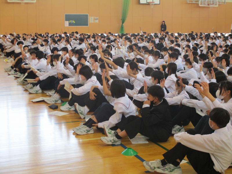 生徒会役員や委員長、各学年のリーダー会からそれぞれの取組について説明があり、その内容や取り組み方について質問や意見が多く出され、それらに対する答弁もスムーズに行われました。