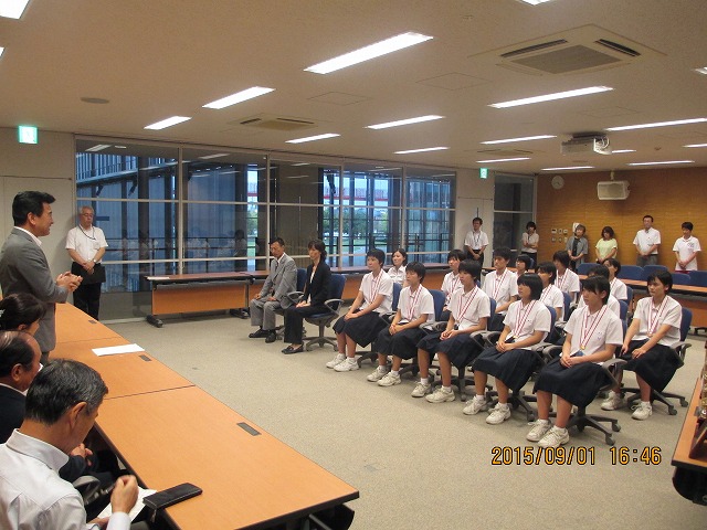 市長に全中準優勝の報告(女子バスケ部) 投稿日時 : 2015/09/02 管理者① 9月1日(火)女子バスケ部が、市長に全中準優勝の報告をしました。市役所では、教育委員の方やたくさんの職員の方に拍手で出迎えていただきました。市長から「期待通りの結果を出してくれた。これを自信と誇りにしてこれからもがんばってください。」とたたえてくださいました。たくさんの応援ありがとうございました。 Tweet {{options.likeCount}} {{options.likeCount}} 0 コメント