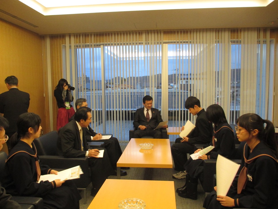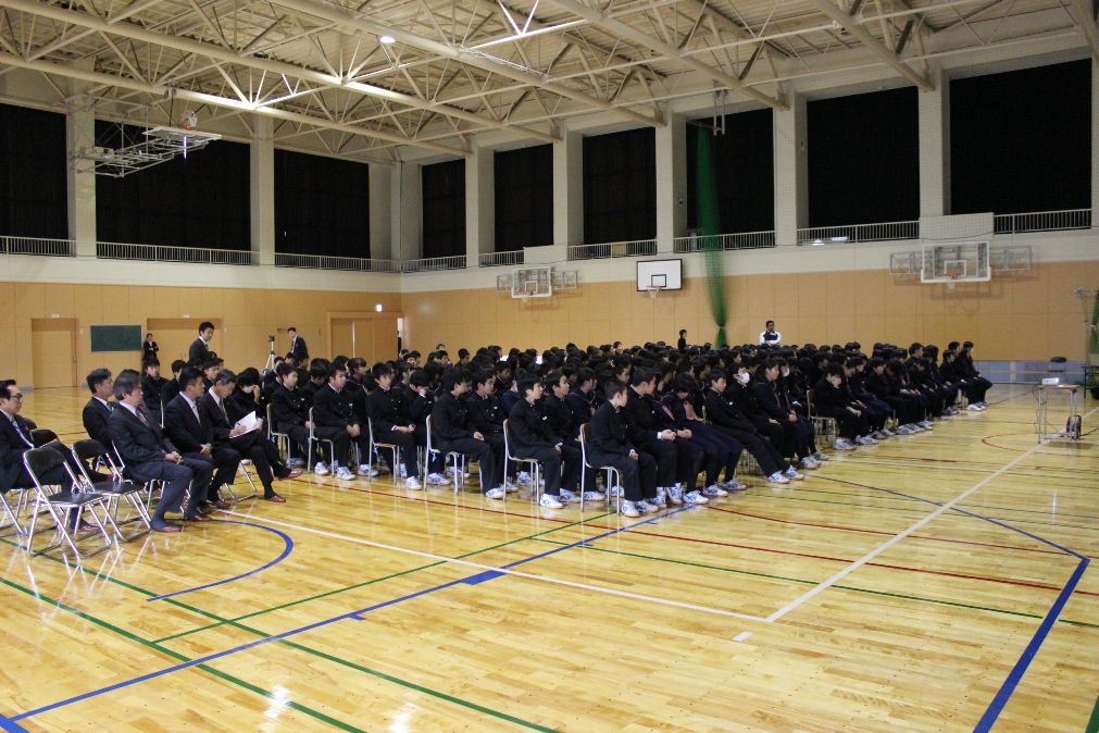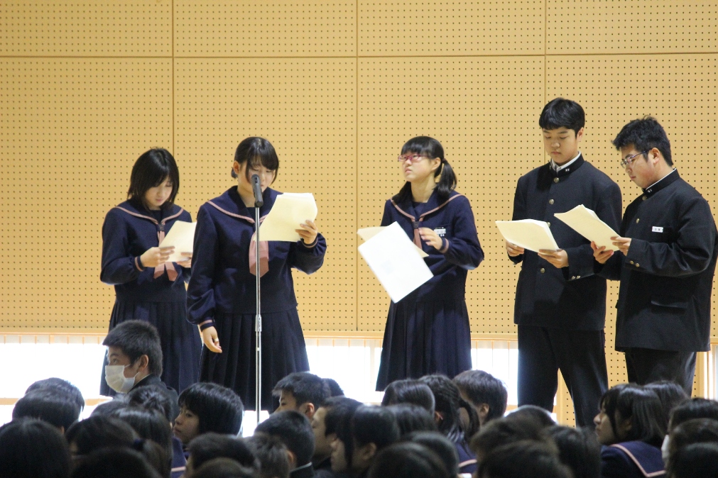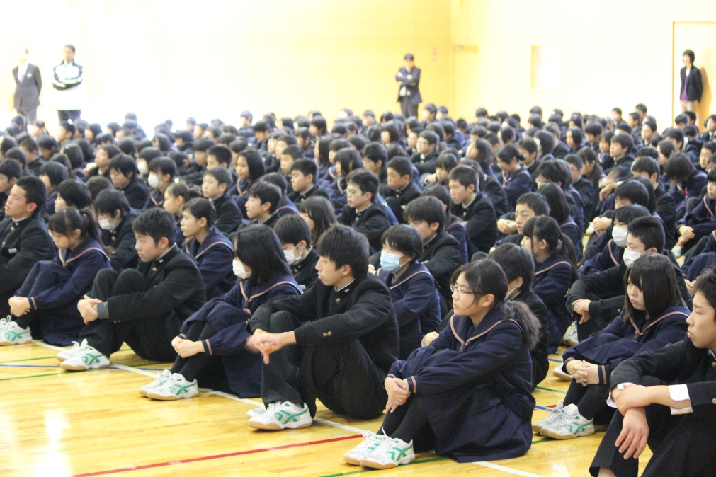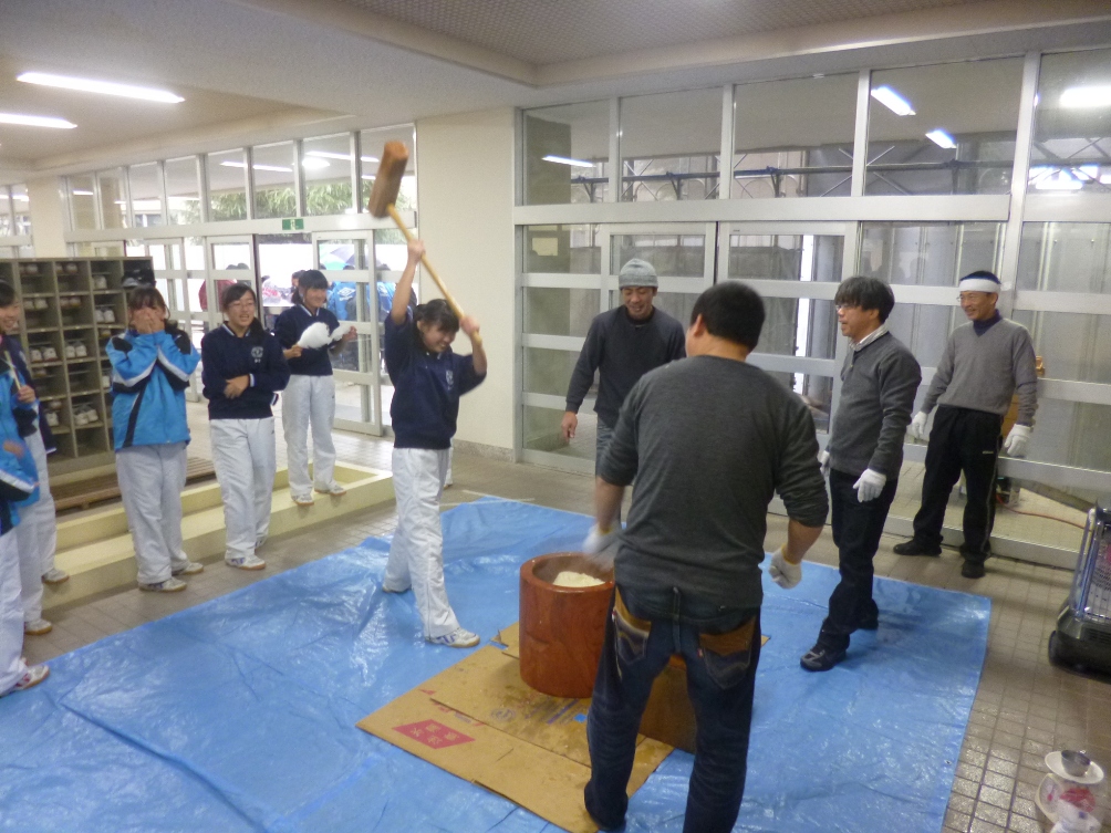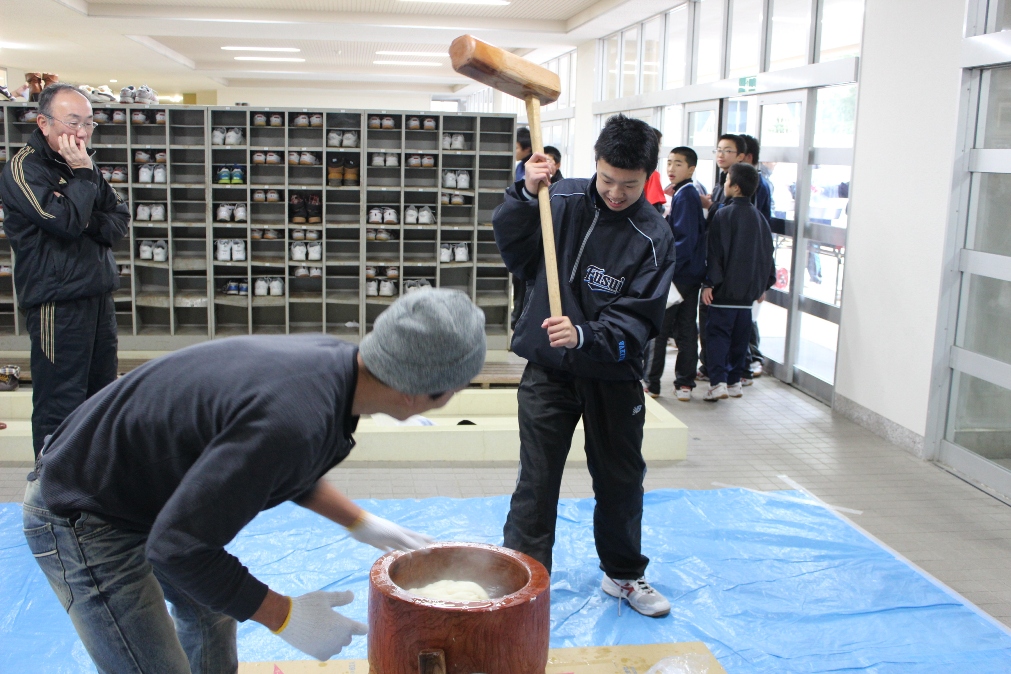 保護者の皆さんや民生委員、花の会の方々と約300人の生徒が、餅つきを体験したり、わ