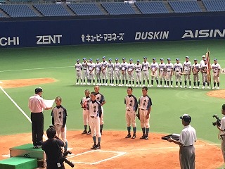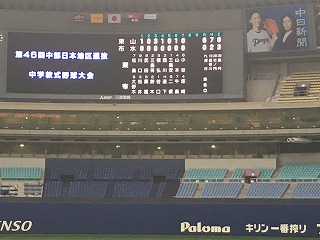 中部日本地区選抜中学軟式野球大会準優勝 投稿日時 : 2016/08/18 管理者① 8月17日(水)中部日本地区選抜中学軟式野球大会が8月15日(月)~17日(水)ナゴヤドームで行われました。http://www.chunichi.co.jp/event/n_chugaku/tournament.html本校野球部は2回戦旭ヶ丘中(岐阜県)にサヨナラ勝ち、準決勝で小川中(静岡県)に完封勝ちをおさめました。決勝は、東山クラブ(愛知県)と対戦し惜しくも敗れました。しかし、石川県勢として決勝進出は、6年ぶりとなる快進撃を見せました。 0 {{options.likeCount}} {{options.likeCount}}