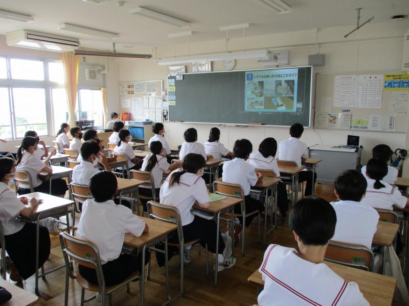 9月1日(水)5限目。白山警察署生活安全課から講師にお招きして、薬物(大麻、麻薬、覚醒剤など)の危険性についてリモート講演していただきました。『薬物は一度でも使用すると脳にダメージが残ること』『遠い世界の出来事ではなくて、身近に危険が潜んでいる可能性があるので、気をつけてほしいこと』など、事例を交えてお話しいただきました。生徒たちも、講師のお話や動画を真剣な表情で見たり聞いたりしていました。