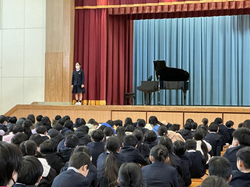 最後は、6年生の福田夏菜さんのピアノ伴奏で、校歌を歌って二学期を締めくくる終業式を終えました。