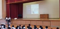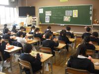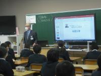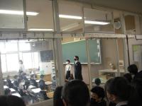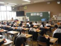野々市中学校の生徒会の3名が6年生に中学校生活についてプレゼンテーションをしてくれました。