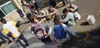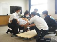 はじめに担架での運び方、次に心肺蘇生、AEDの訓練を行いました。