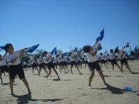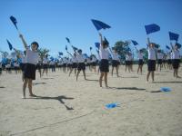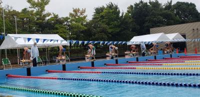 プールサイドには1m刻みに印がついておりそれを目安に並びます。