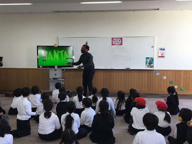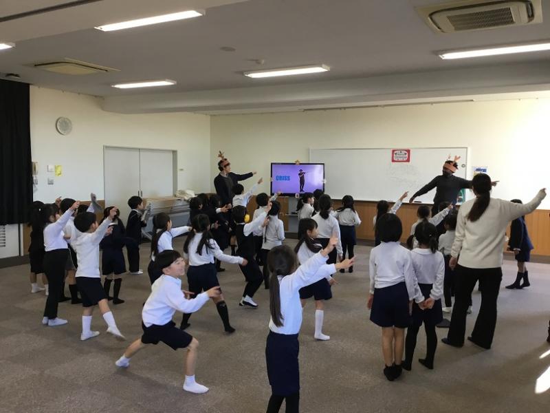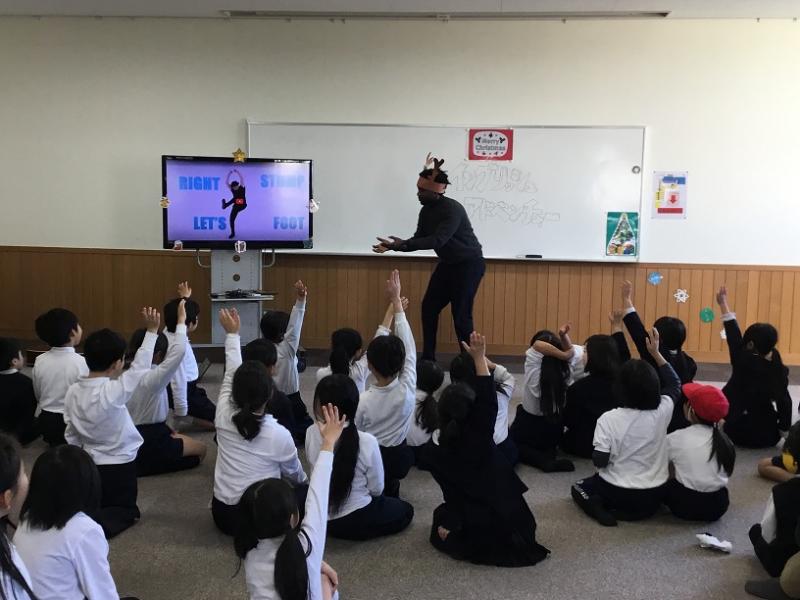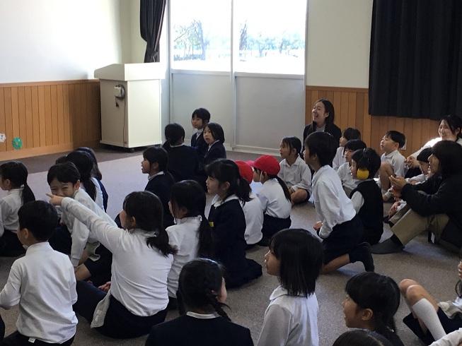 昼休みに 多目的室で1・2年生を対象に外国語あそびが行われました。