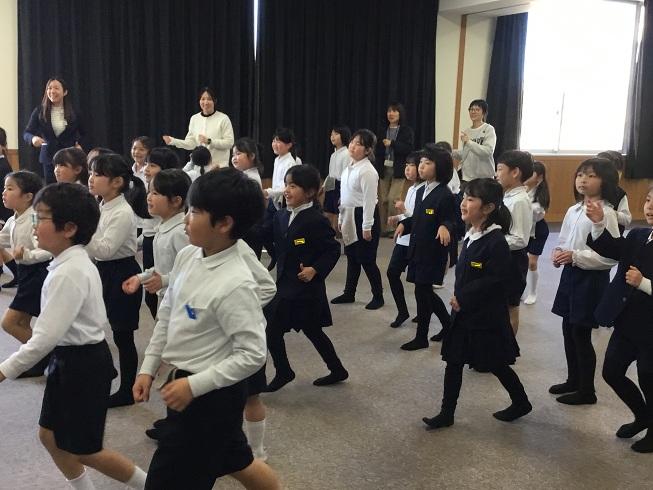 ▶6限 3・4年生 中学年が混ざり合って一緒に練習をしていました。4年生が3年生の手本になっています。