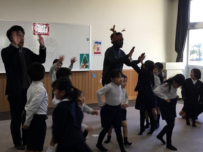 外国語担当の吉村先生とALTのアミヌ先生が、トナカイの耳を付けて出迎えてくれました。