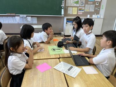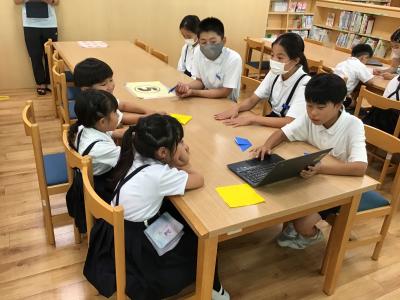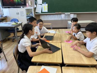 まず、クロムブックを使って、上の学年の子供が、下の学年の子供に、平和に関する本の読み聞かせをしました。