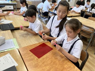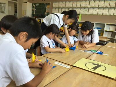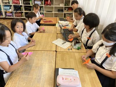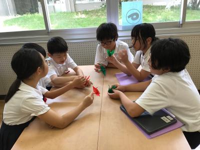 今回は、平和への取組として、ペア学年で折り鶴を折りました。