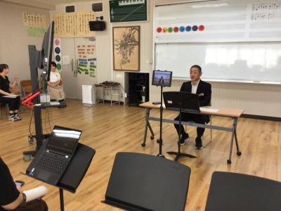 お話する先生たちは、音楽室から配信です。