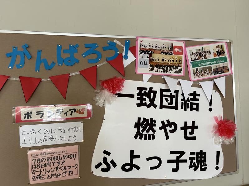 児童会で決めた今年度の運動会のテーマ「一致団結!燃やせふよっ子魂!」