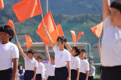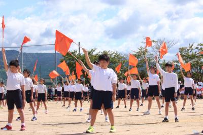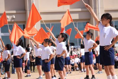 5年生の名札の色、オレンジ色の旗をもって、演技しました。