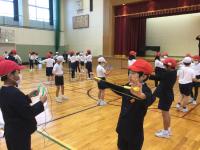 体育館で、年長さんと1年生が対面です。