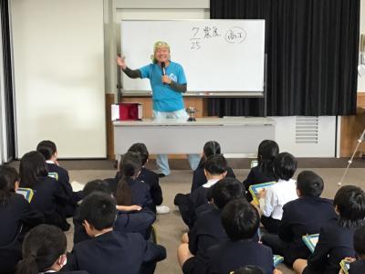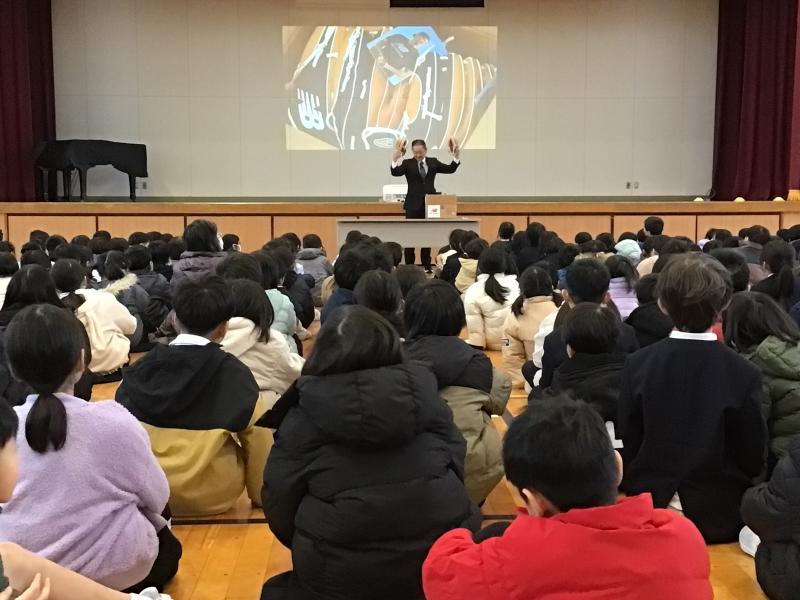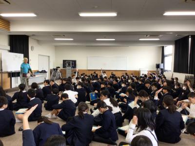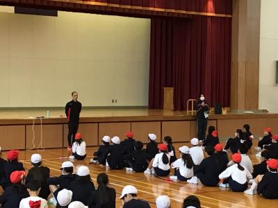 1限目。全校の子ども達が体育館に集まり、宮口先生のお話を聴きました。