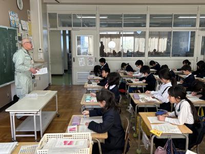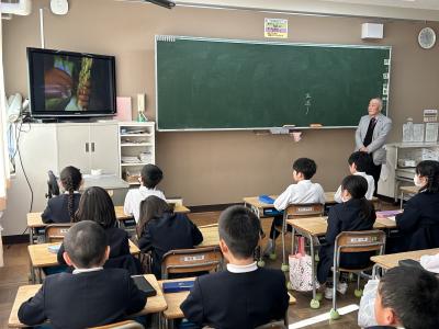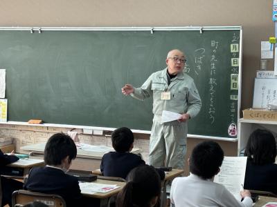 2月7日(水)、町の学習をしている3年生が、ゲストティーチャーに来てもらってお話を聴く学習をしました。