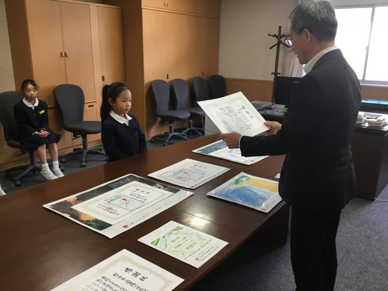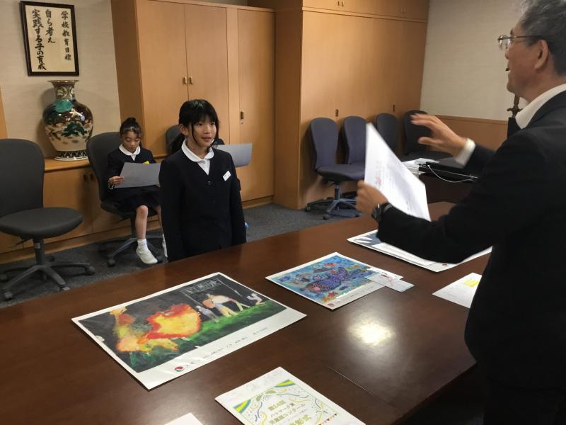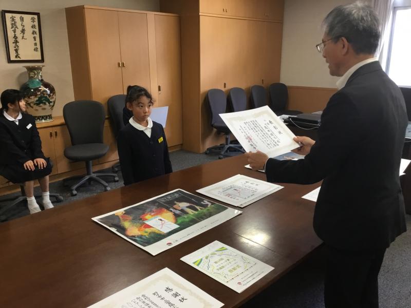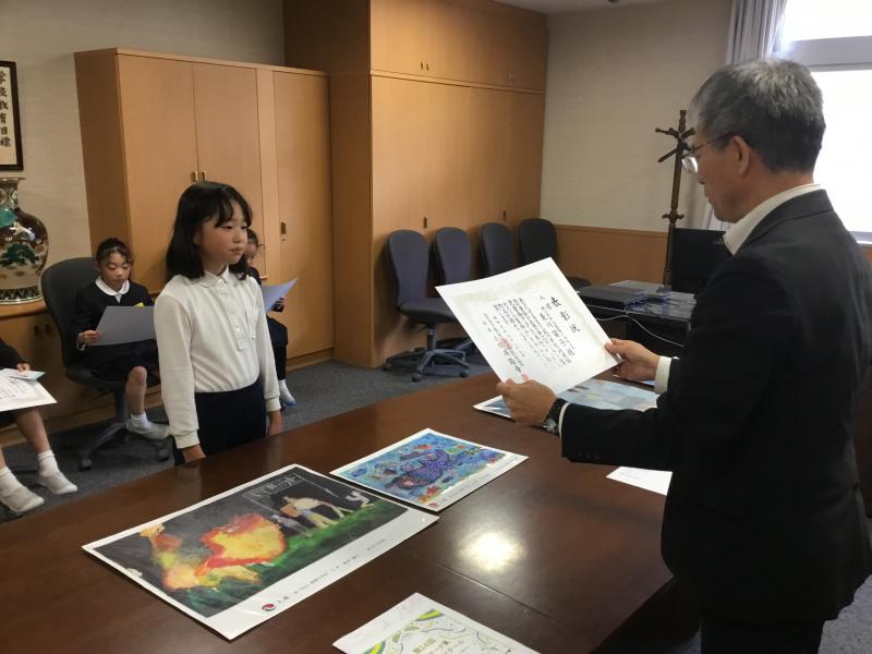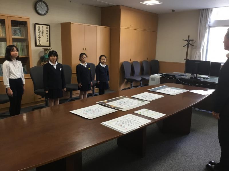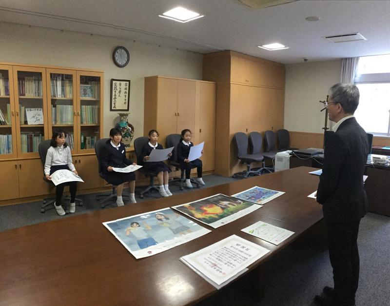 昼休みに ハトマーク賞児童画コンクールで入選した4人への表彰式を行いました。