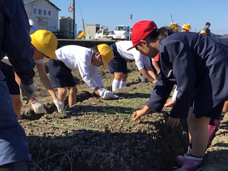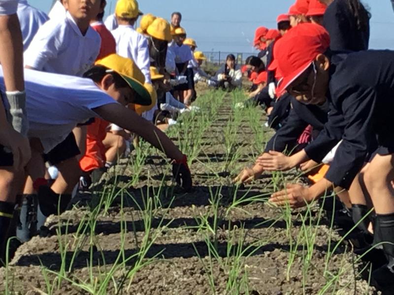 1・2限目に 3年生が学校近くの畑に玉ねぎの苗を植える体験をしました。