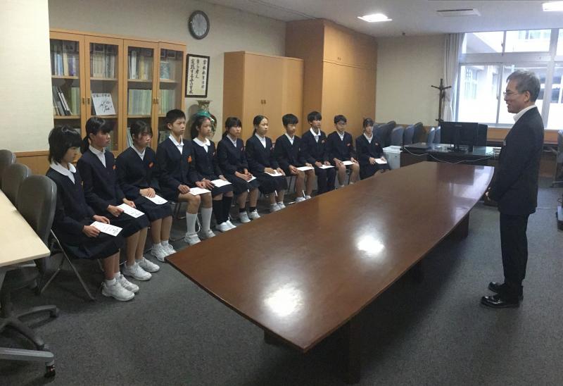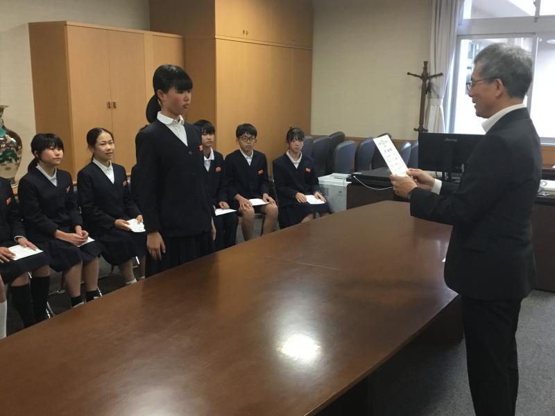 昼休みに 前期委員会活動の中心となって活躍した委員長や副委員長に感謝状を渡しました。