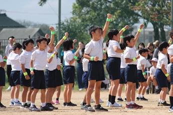 クラスごとに色の違うシュシュを両手に付けて、運動場いっぱいに広がって踊りました。