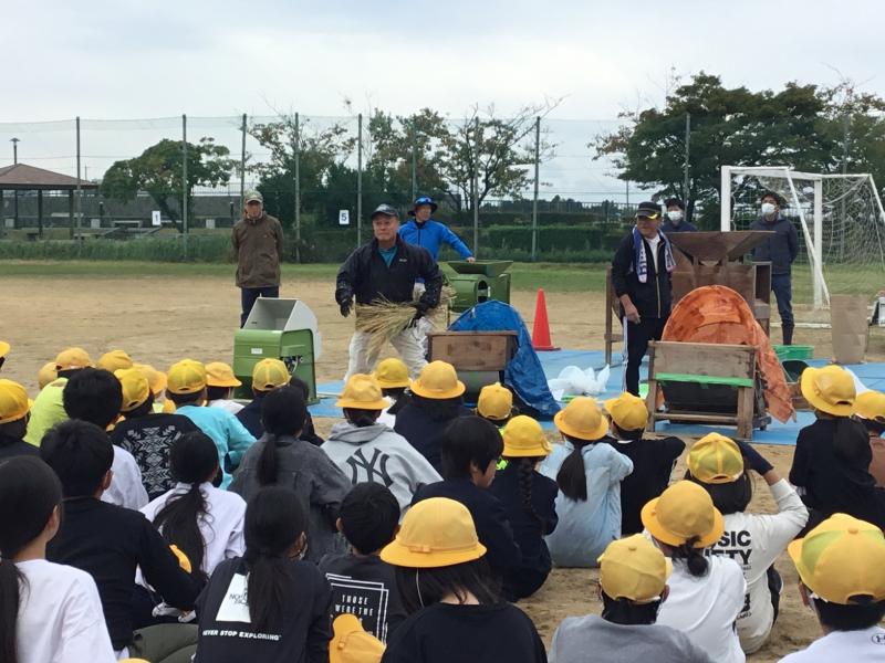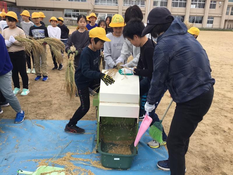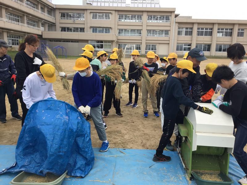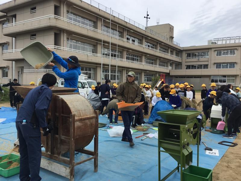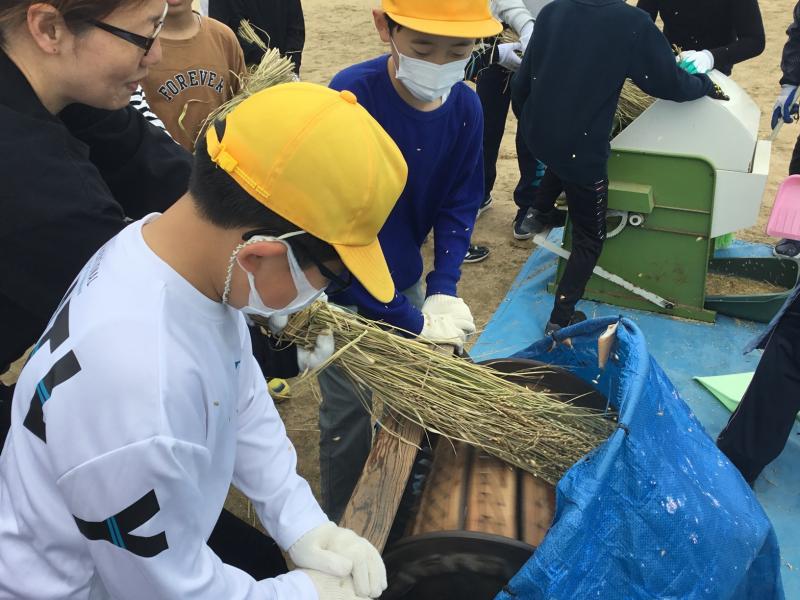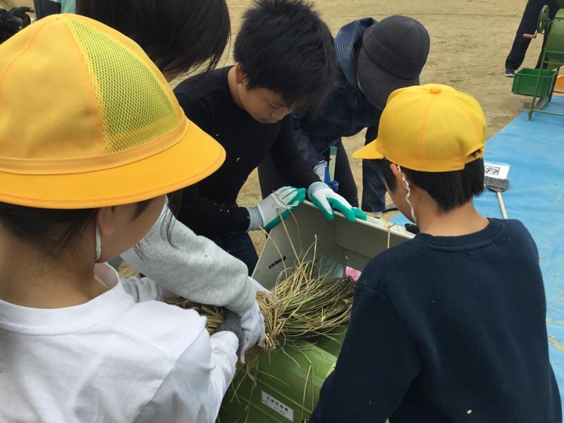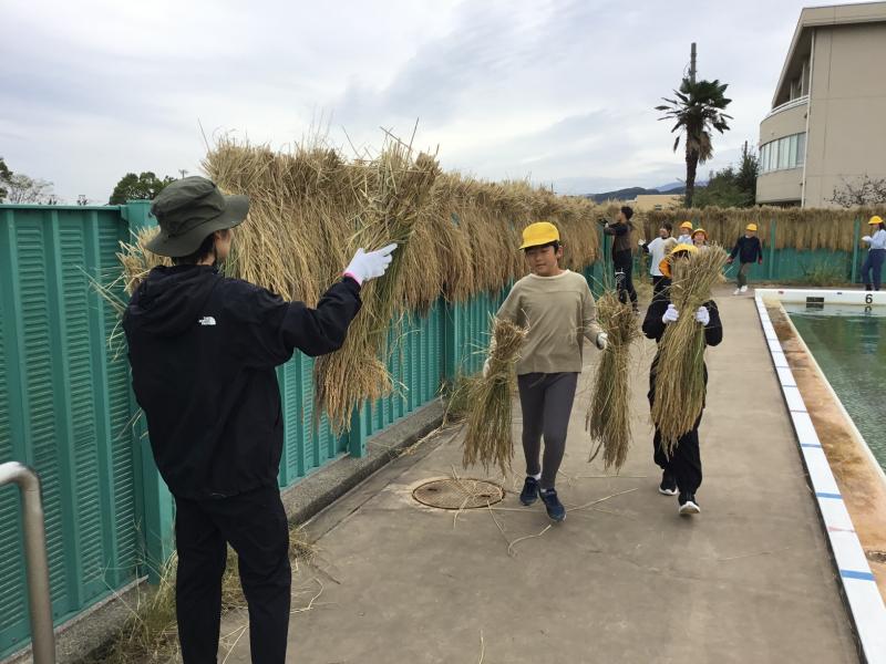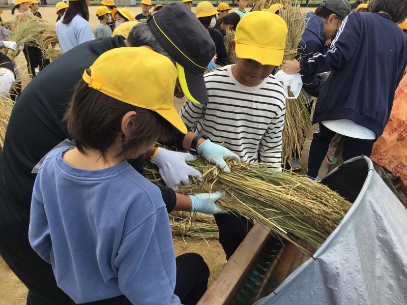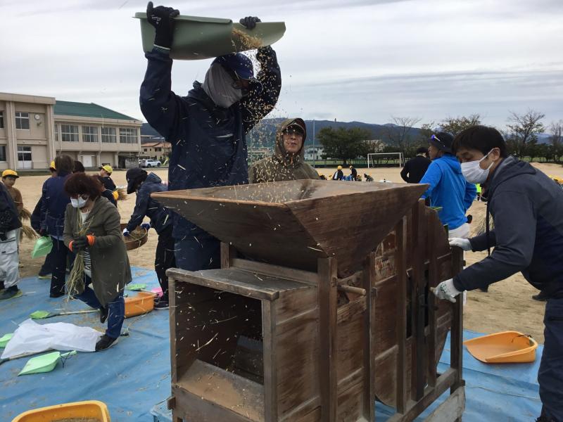 10月6日に刈り取り プールサイドに干してあった稲穂を運動場に運び、脱穀機で米粒を取り除きました。