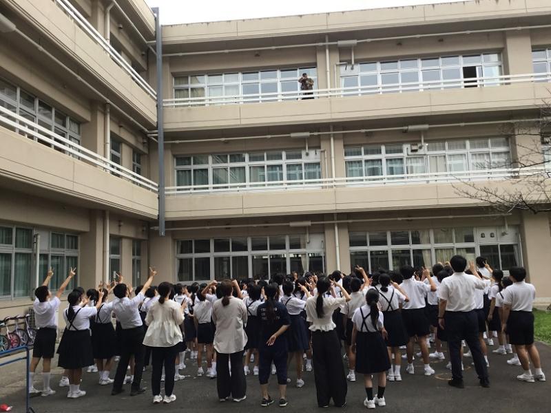 ▶1限 2年生 運動場に出て 曲に合わせて体を大きく使って踊れるように 練習をしていました。