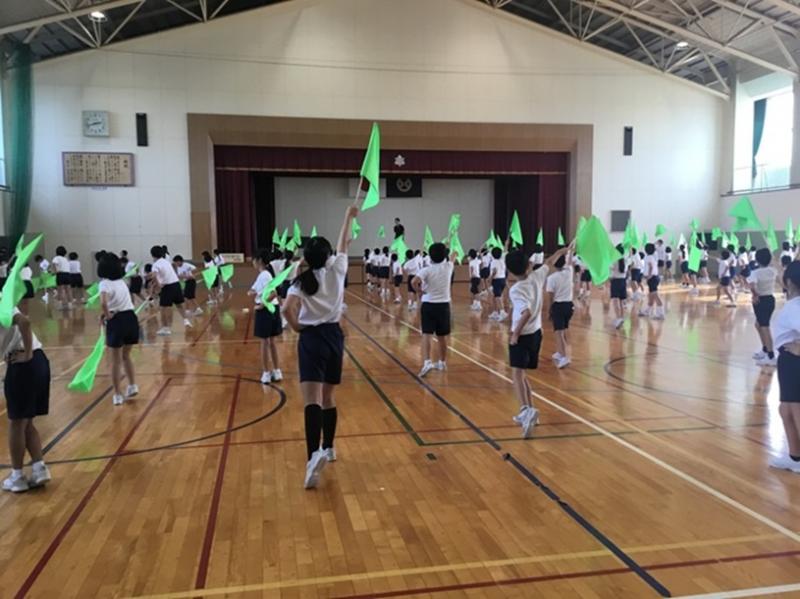 ▶6限 3・4年生 中学年が混ざり合って一緒に練習をしていました。4年生が3年生の手本になっています。