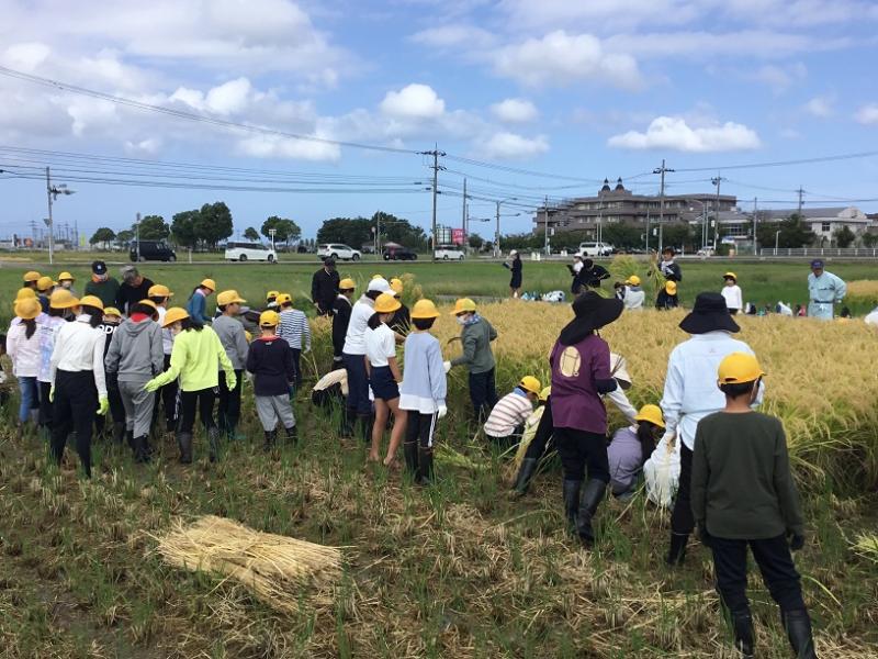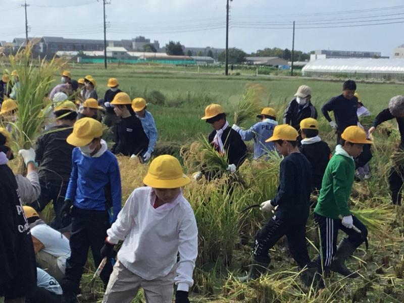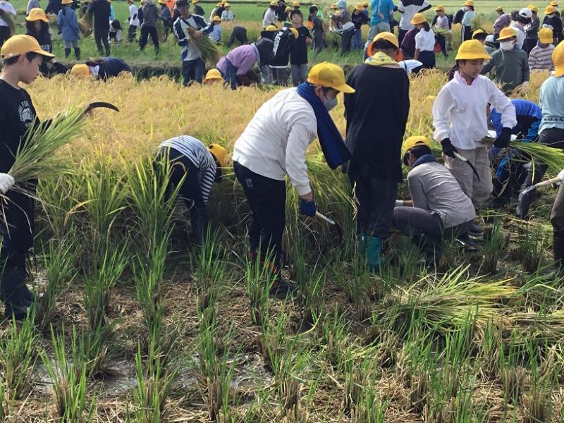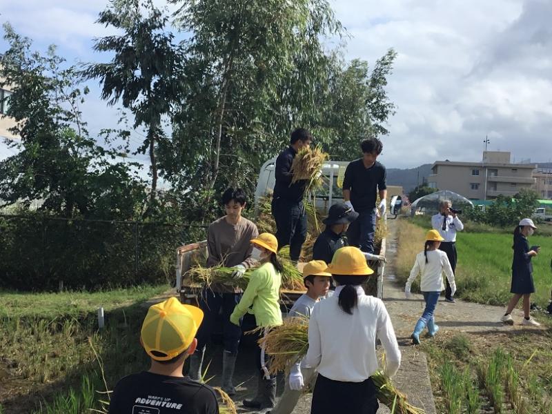 5年生は鎌で稲を刈り、束ねられた稲をトラックまで運びました。