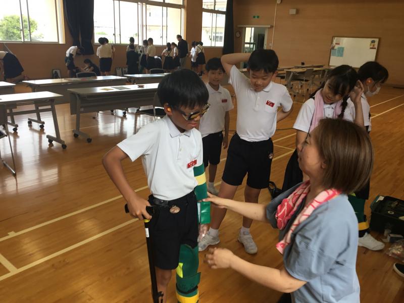 今回は 市社会福祉協議会の方々、民生委員やボランティアの方々にゲストティーチャーとして来ていただき、高齢者疑似体験を行いました。