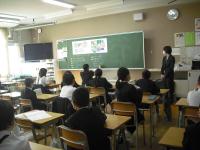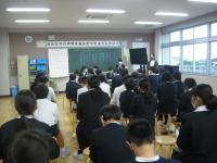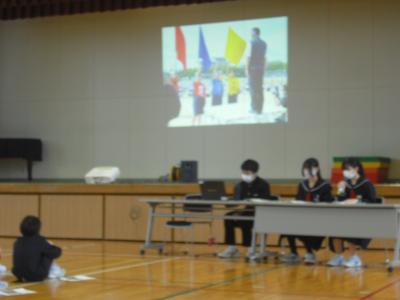 野々市中学校の生徒会の3名が6年生に中学校生活についてプレゼンテーションをしてくれました。