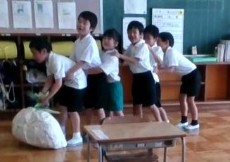 自学の取組にも関連付けて、鬼はバナナ、逃げる方は魚に分かれて、おにごっこをしました。