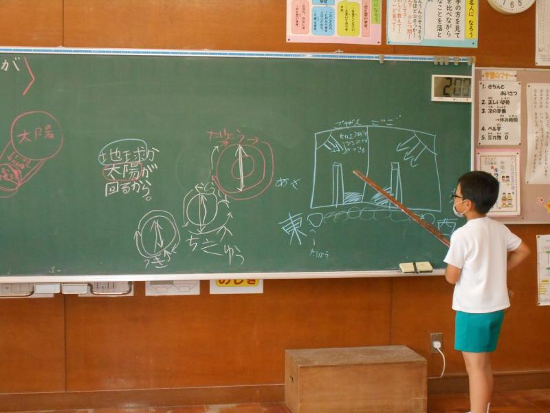 時間がたつとかげの向きがかわるのはどうしてか、ノートに予想を書いた後、図を書いて説明していました。