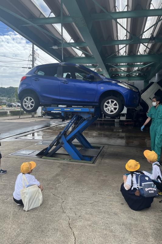 車の修理をするために、車をのせた台があがる工夫やタイヤのホイールの付け方など、仕事の様子を見学させていただきました。車の点検や修理のために、お客さんと相談する部屋や整備する部屋もありました。普段目にすることのない道具や部品に、2年生は驚いていました。