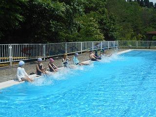 プールサイドで、足→手→おなか→むねと順に体を水に慣らしてから、プールに入ります。