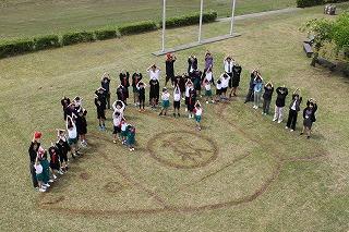 萩野台の自学キャラクター「萩魚王(はぎうおおう)」が、なんと今年も芝生の中に出現しました。校務員さんがつくってくださいました。