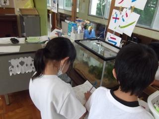 3時間目に1年生教室に行くと、グッピーの観察をしていました。