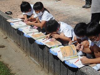 3年生は、今日1日、太陽の位置は変わるのかを調べます。かげは太陽の向きと反対側にできることを利用して、太陽の位置を記録していきます。正確に記録できるように、慎重に行っていました。