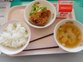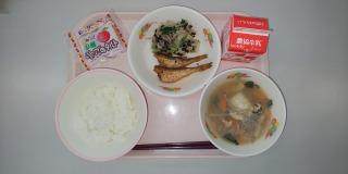 今日の献立は秋田県の献立で、ハタハタのから揚げ、磯香和え、きりたんぽ汁とりんごのタルトでした。ハタハタは秋田県の県の魚で、ハタハタからつくる魚醤のしょっつるは秋田県の名物です。きりたんぽは、ごはんからつくる団子で、丸状のものと細長い棒状のものがあります。今日は棒状のものを切って汁に入れました。ごちそうさまでした!