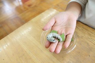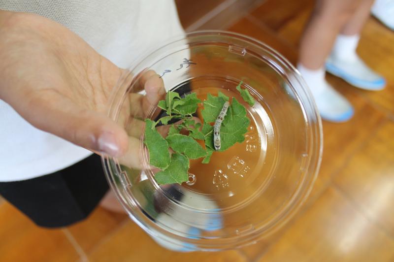 生徒さんたちは、手のひらに幼虫をずっと乗せているほどカイコが大好き!