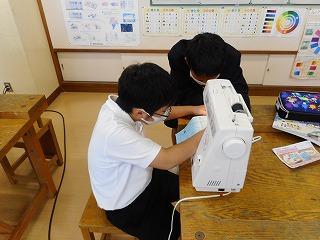 ①布をたつ ②上、わき、すそを3つ折りにして縫う ③ひもを通すところを縫う ④ひもをとりつける ⑤ポケットを縫う ⑥ポケットに飾りをつける の6つの工程・作業を丁寧に進めていきました。
